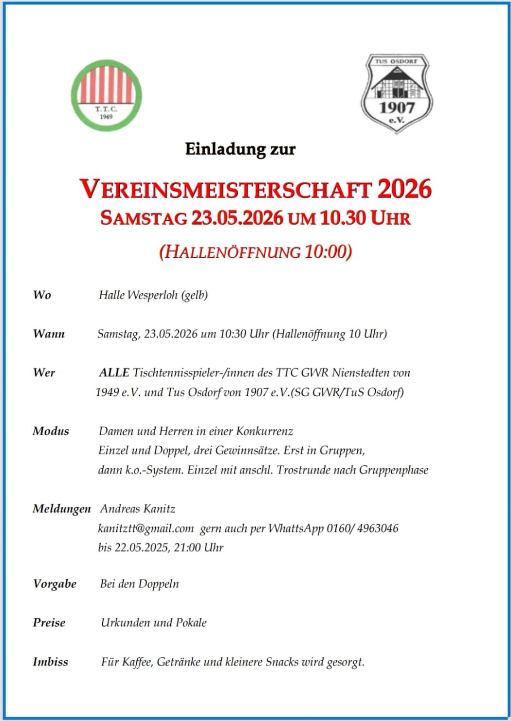 Entnommen aus der Webseite https://www.kirschenklopper.de/2026/02/24/7-von-12-ueber-die-volle-distanz/ 7 von 12 über die volle Distanz…eine traumhafte 5-Satzquote verhalf der Dritten zum Sieg gegen Osdorf. Aus den Doppeln gehen wir… PS 1. Herren vs. Eilbeck 3. 3:9 weiterlesen - SG-Vorgabe-Team-Meisterschaften 2026